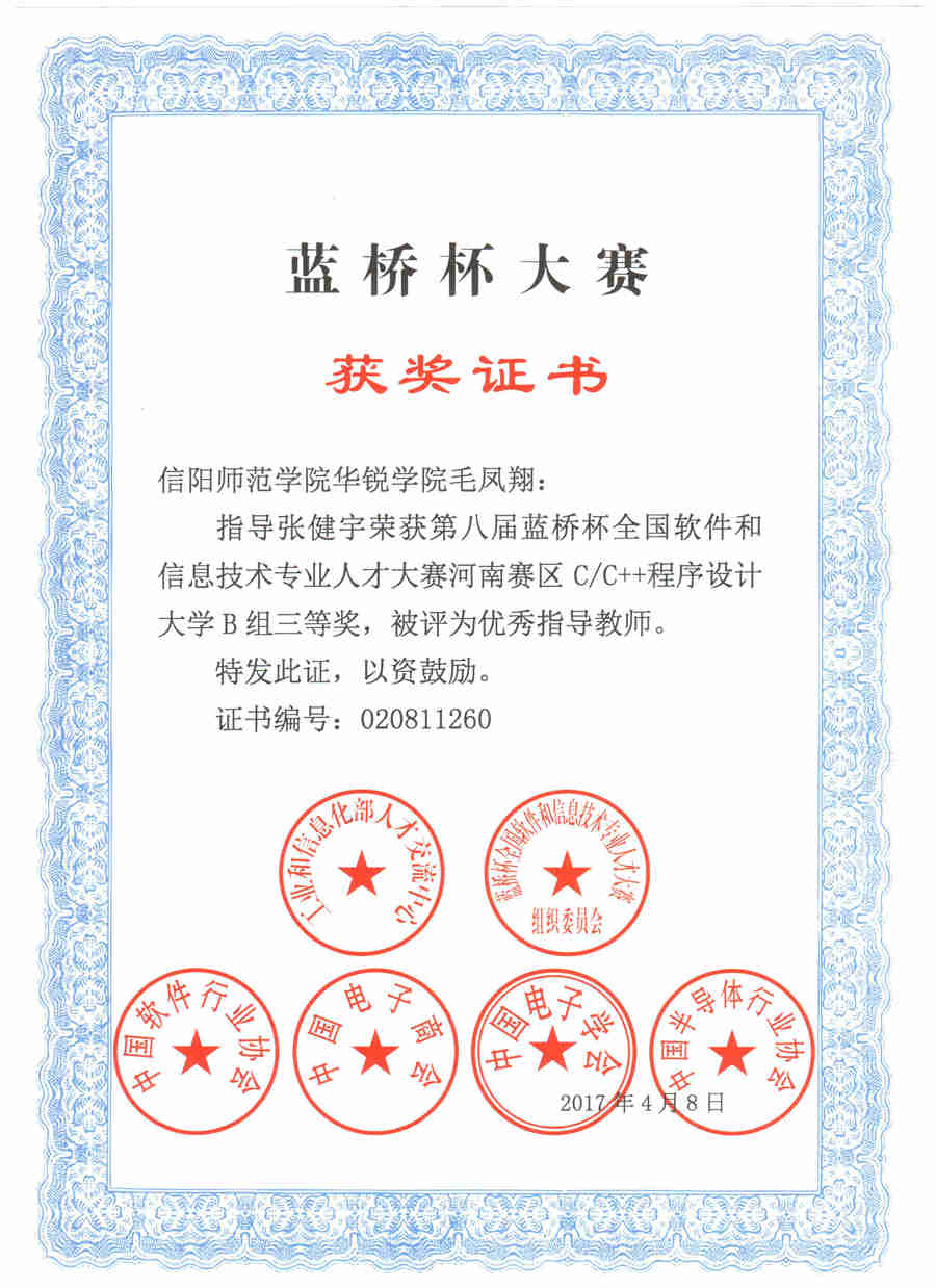 由工业和信息化部人才交流中心、教育部全国高等学校学生信息咨询与就业指导中心联合举办的第八届蓝桥杯全国软件和信息技术专业人才大赛落下帷幕。我校参赛学生在本次比赛中荣获佳绩,其中,数学与信息学院2014级张健宇获C/C++类B组河南赛区三等奖;毛凤翔被评为“优秀指导教师”。