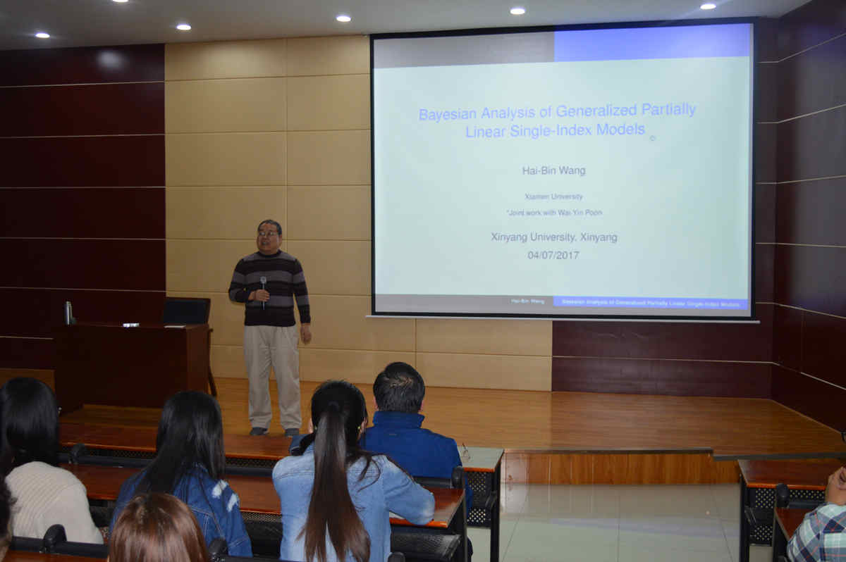 4月7日,厦门大学博士生导师王海斌教授应邀在我校图书馆学术报告厅作了题为“Bayesian Analysis of Generalized Partially Linear Single-Index Models(广义部分线性单指标模型的贝叶斯分析)”的学术报告。相关专业200余名师生聆听了报告会。报告会由数学与信息学院院长郝涌教授主持。