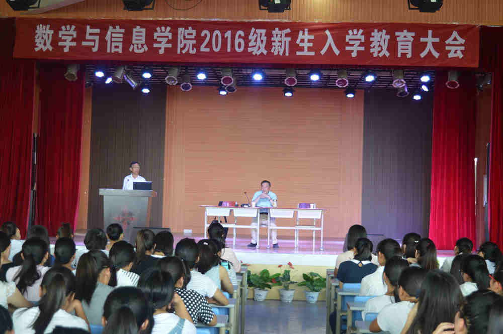 郝涌教授向大家介绍了现代大学的发展历程,他以“大学之道”为主题,向在座师生阐述了“什么是大学,如何上大学。”并结合自身多年的教学经历和我系毕业校友的实例,向与会师生介绍了数学专业的学习方法、就业前景。最后对2016级新生提出三点建议:一、要立志,每个学生都要规划好自己的大学四年,明确奋斗目标,有目标才有前进的动力;二、要务实,坚决不做“语言上的巨人,行动上的矮子”,将自己的理想规划都落在实际行动中;三、要不断提高综合素质。利用学校丰富的图书资源,除了学好专业课外,多读一些文史哲类的书籍;合理安排课余时间,积极参加各类社团活动、集体活动,锻炼体质,修炼品格。