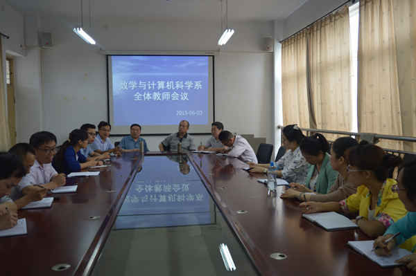 6月3日下午,数学与计算机科学系在数计楼510室召开全体教师工作会议。系主任郝涌教授、特聘专家裴惠生教授及全体教师参加了本次会议。