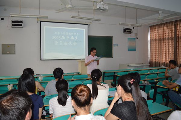 5月18日上午,数学与计算机科学系在数计楼203室召开2015届毕业生党员座谈会。系党总支副书记秦笠,系党总支组织委员、系学工秘书余兴旺,2015届毕业班班主任周扬及39名毕业生党员参加了座谈会。