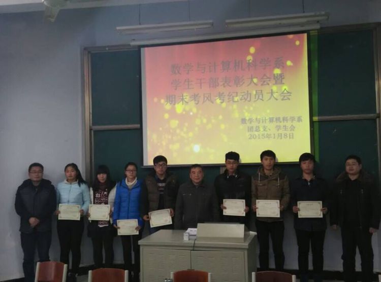 2015年1月8日中午,数学与计算机科学系在数计楼106室召开了学生干部表彰大会暨期末考风考纪动员大会。系主任郝涌教授;系秘书余兴旺、秦笠;辅导员李平、王晶、司杰、周扬;系团总支、学生会全体成员及各班班长、学习委员参加了本次会议。大会由秦笠主持。