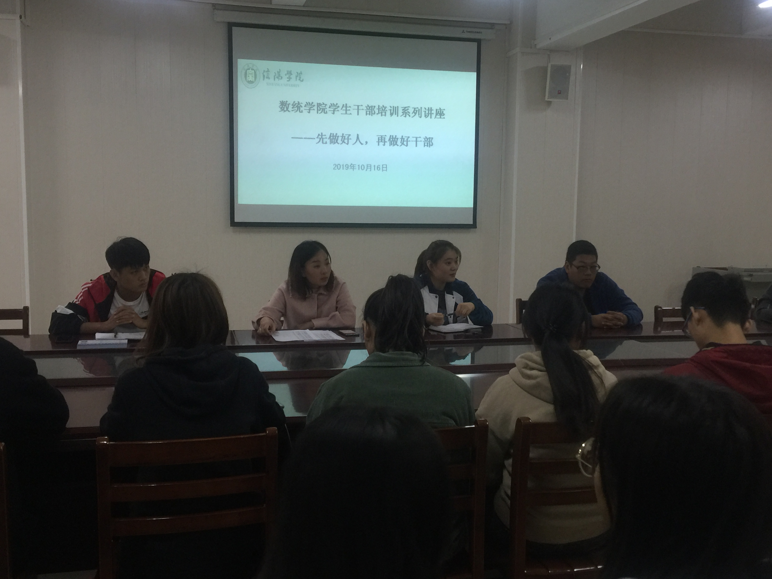 在我校“不忘初心、牢记使命”主题教育的推动下,为提高数统学院学生干部的基本素质和为学生服务的思想认识,党总支副书记李平老师于10月16日中午对该院大一到大三的学生干部进行了培训。