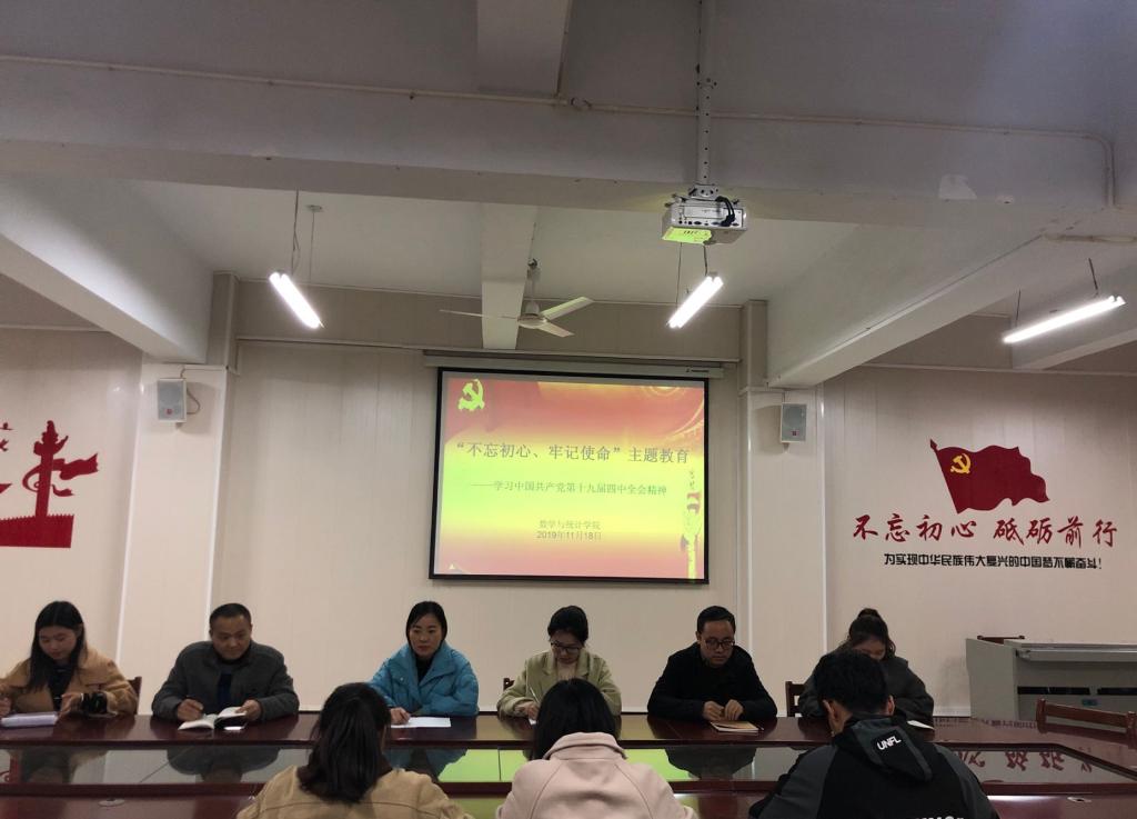 11月18日下午,数学与统计学院党总支在数计楼407会议室集中学习举行党的十九届四中全会精神。党总支副书记李平以及全体师生党员参加了此次集中学习。