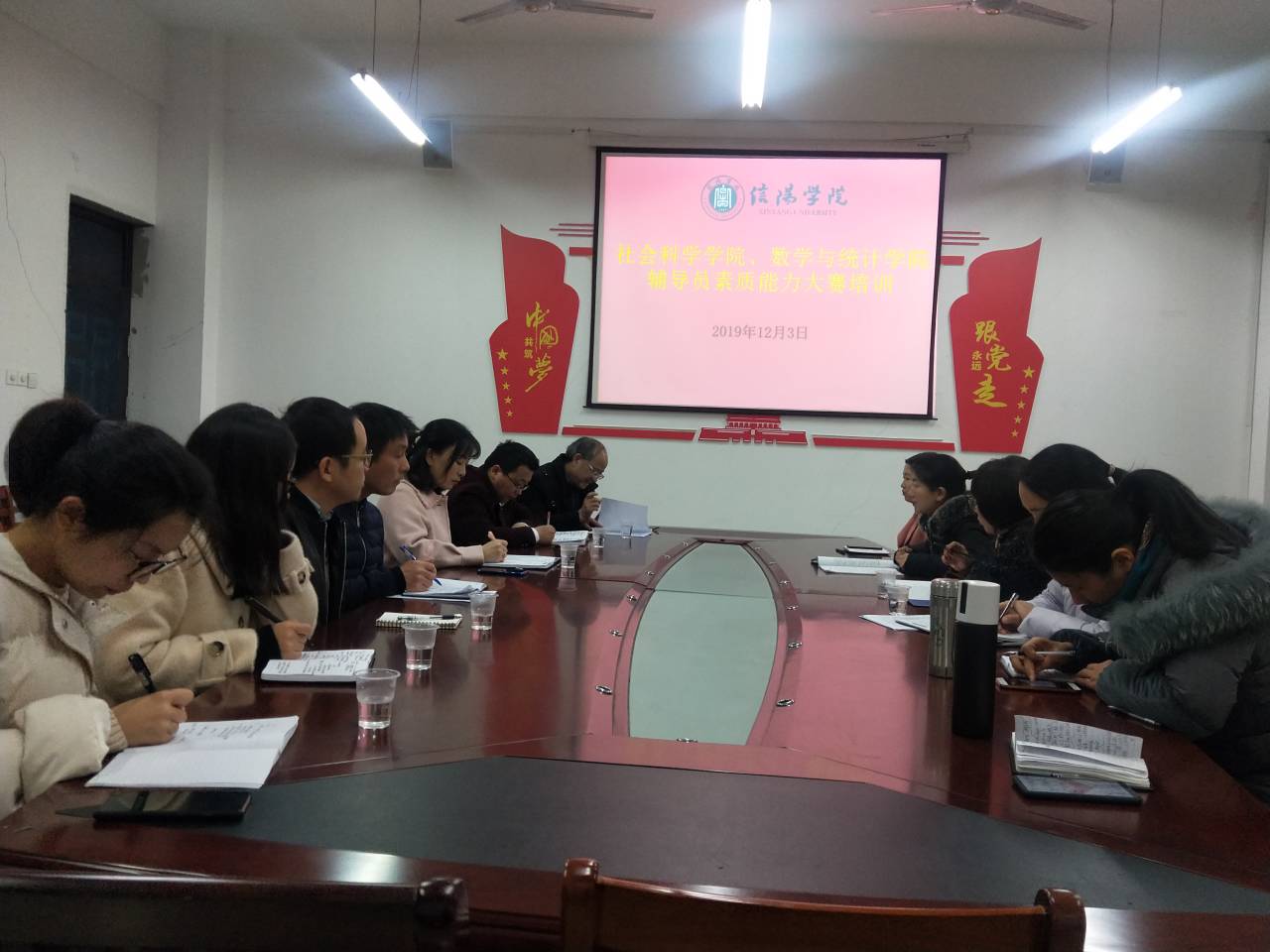 为深入贯彻落实全国和全省高校思想政治工作会议精神,落实我校关于举办第九届辅导员大赛的通知和相关要求,进一步加强辅导员队伍建设,推动辅导员队伍专业化、职业化发展。社会科学学院、数学与统计学院于12月3日上午在社科楼一楼会议室举行辅导员素质能力大赛赛前培训会,社会科学学院名誉院长张院长、党总支副书记胡志国、数学与统计学院党总支副书记李平及两个学院全体辅导员参加会议,会议由王晶主持。