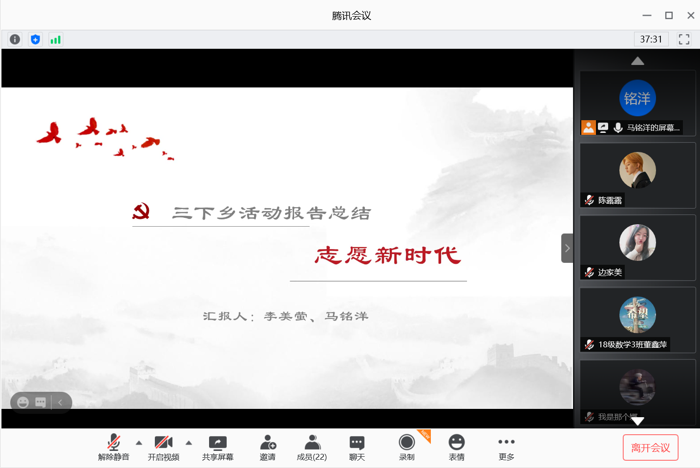 8月26日下午,数学与统计学院主题团日活动通过腾讯会议开展。参加此次会议的有“三下乡”项目活动团队成员,项目指导老师以及团总支学生会学生干部。