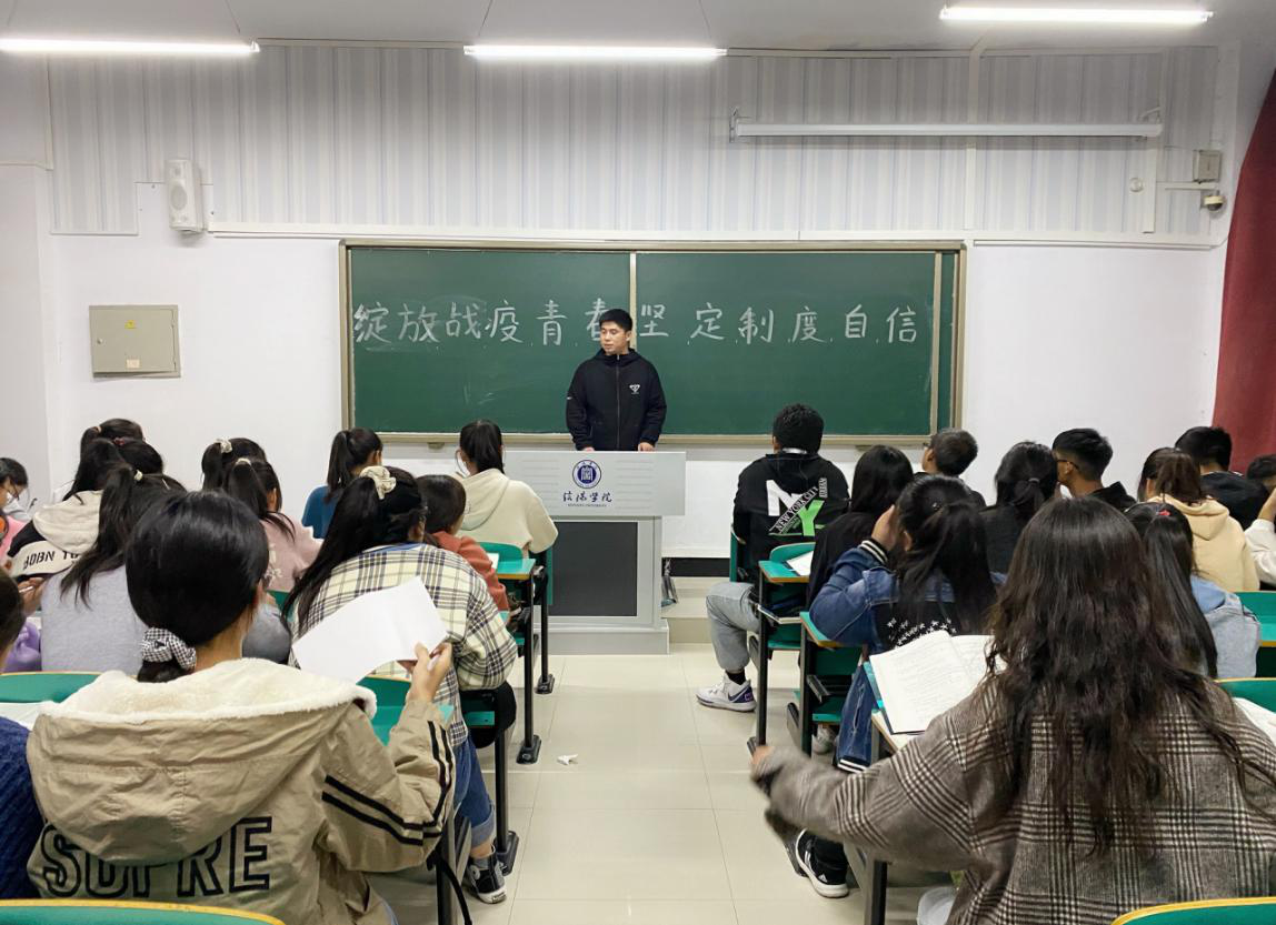 为进一步明确作为新时代青年学子的责任与担当,激励和引导青年团员进一步坚定“四个自信”、厚植爱国情怀、强化责任担当。数学与统计学院团总支于11月20日在数计楼505教室开展了“绽放战疫青春·坚定制度自信”主题团课活动,本次主题团课由该院辅导员胡涛老师主讲,学生会主要成员及部分新生团员代表参加。