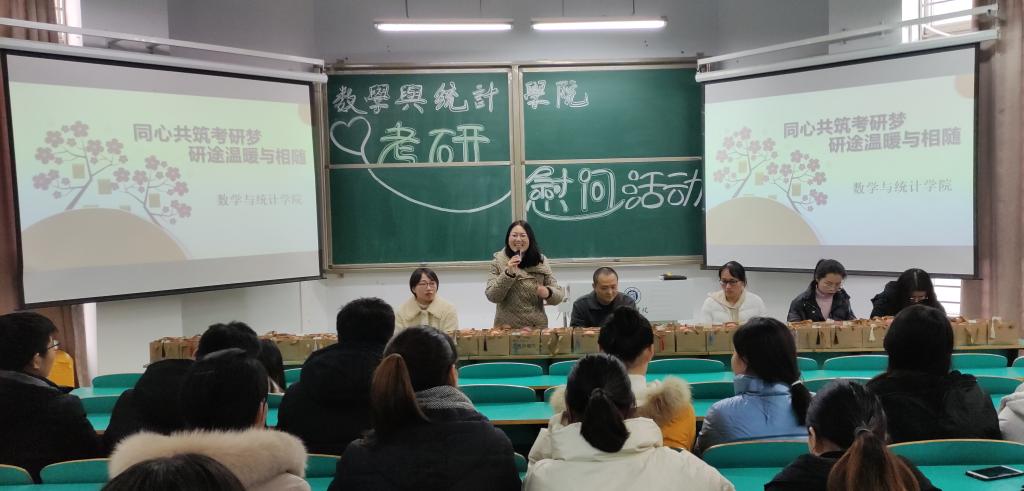 一年一度的全国硕士研究生考试在即,考研进入倒计时,考研氛围浓厚,为给考研学子加油鼓劲,引导同学们调整心态,劳逸结合,发挥最好水平。12月9日中午,数学与统计学院在数计楼107教室开展了考研慰问活动,为考研学生送上数学与统计学院考研加油包和考研祝福卡。党总支副书记刘颖方,教学副院长张聪,行政干事闫珍珠,学工干事田媛,全体辅导员老师以及2021届考研学生参加了此次会议。会议由田媛主持。