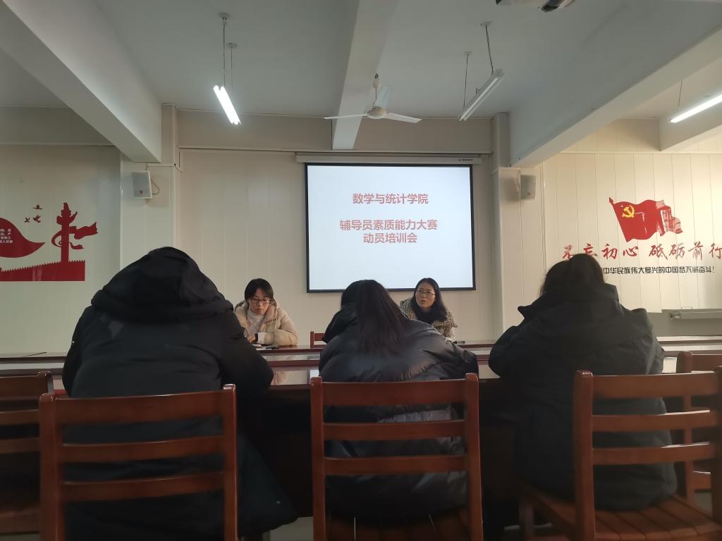 12月10日下午,数学与统计学院在数计楼407室召开第十届辅导员素质能力大赛培训动员会。院党总支副书记刘颖方,学工干事田媛及全体辅导员参加了本次会议。