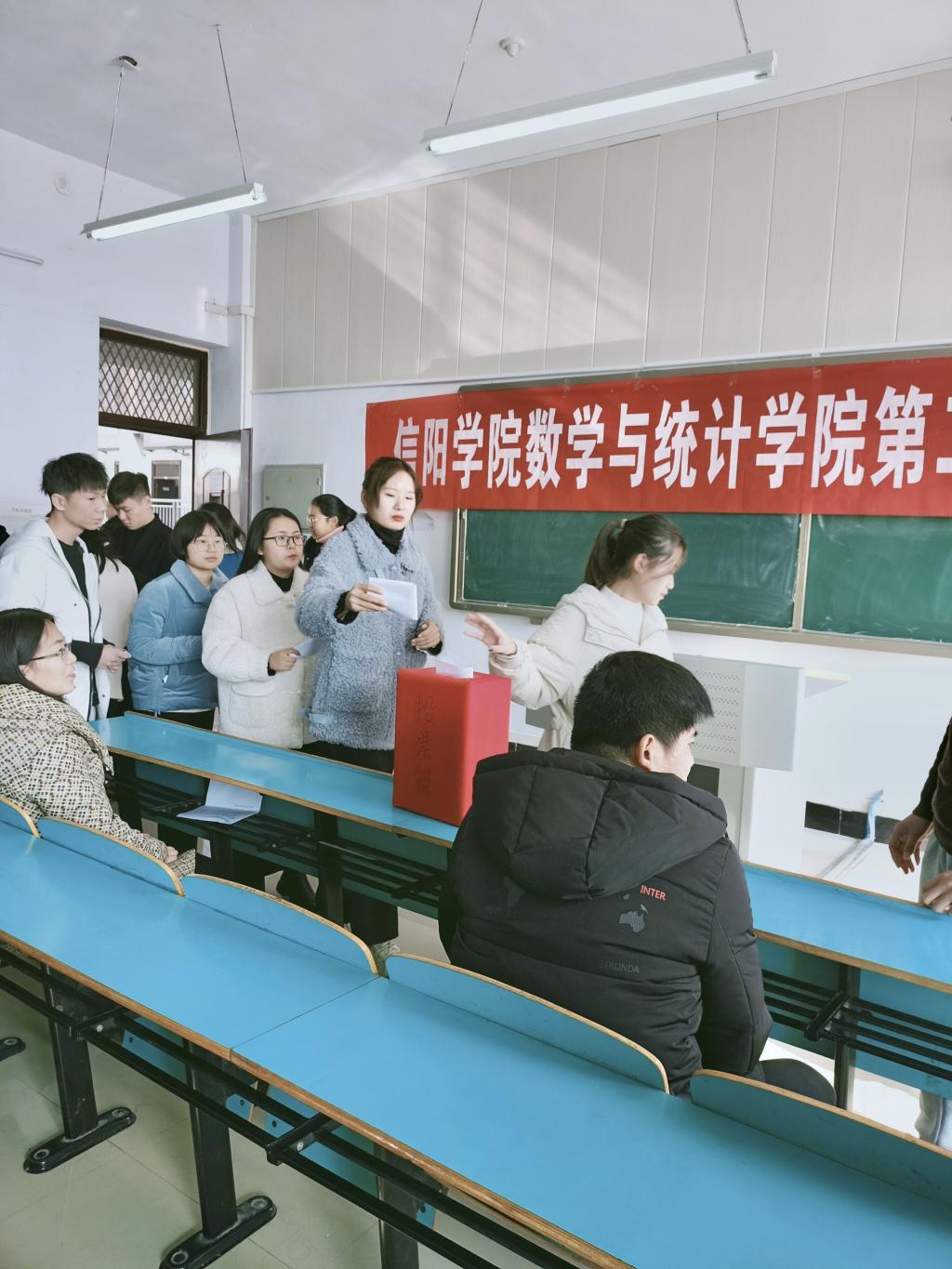 在征集了与会各级各班学生代表的意见后,会议先后通过了《数学与统计学院关于推选参加信阳学院第二次学生代表大会的正式代表的选举办法》、监票人以及计票人名单。按照选举章程规定和候选人名单,各级各班学生代表进行了民主投票,经监票人计票人的统计,会议选举产生了11名正式代表参加信阳学院第二次学生代表大会。
