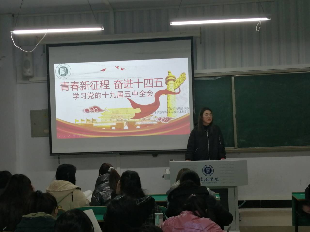 根据校团委统一部署,为学习宣传贯彻党的十九届五中全会精神,加强班风、学风建设,提高青年团员们的党性意识和整体素质,数学与统计学院团总支于2020年12月21日在数计楼开展了“青春新征程 奋进十四五”学习党的十九届五中全会精神团日活动,院属各团支部积极响应,根据班级情况灵活设计开展了本次主题团日活动。