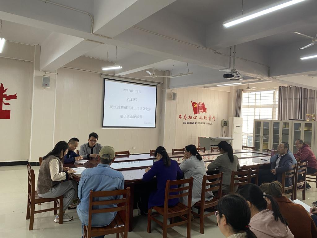 为确保2021届毕业论文检测工作、答辩工作顺利开展,以及学院老师熟悉并正确使用格子达论文检测系统的相关功能。4月13日下午,数学与统计学院在数计楼407会议室召开论文检测和答辩工作计划以及格子达系统培训会议。学院党总支副书记刘颖方、教学副院长张聪、学院全体老师参加了此次会议,会议由张聪副院长主持。