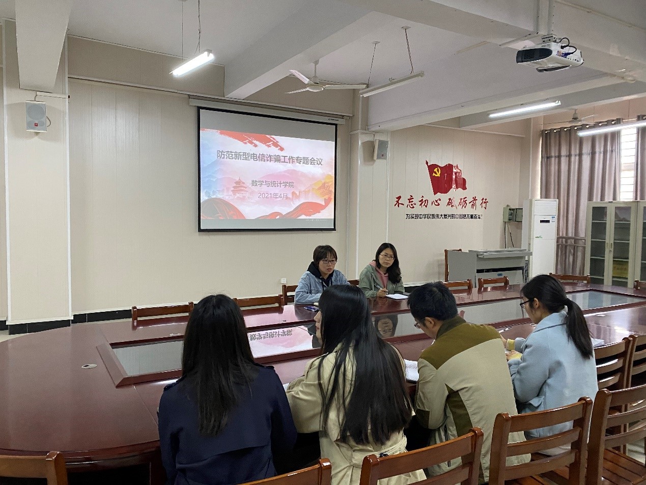 为进一步增强广大师生的安全防范意识,提高识骗防骗能力。根据学校通知精神,数学与统计学院在4月23日上午召开了防范治理电信网络新型违法犯罪工作专题会,学院党总支书记刘颖方、学工干事田媛,全体辅导员参加了此次会议。