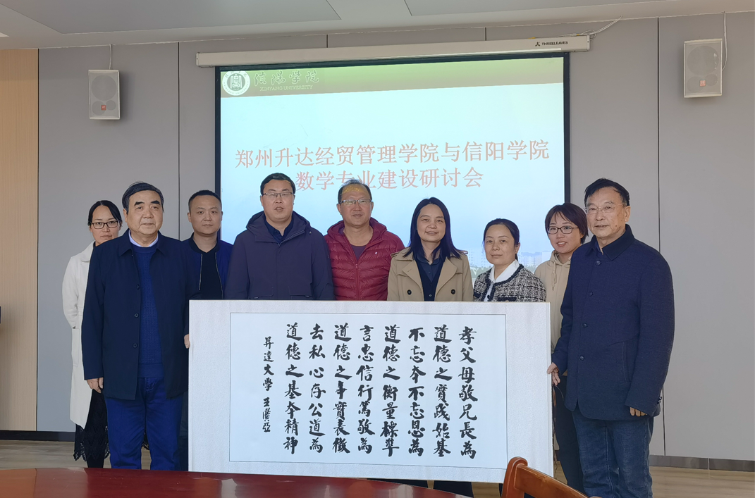 会上,郑州升达经贸管理学院一行还向信阳学院数学与统计学院赠送了创办人书法作品,希望今后继续加强交流,共同努力办精办优数学专业。
