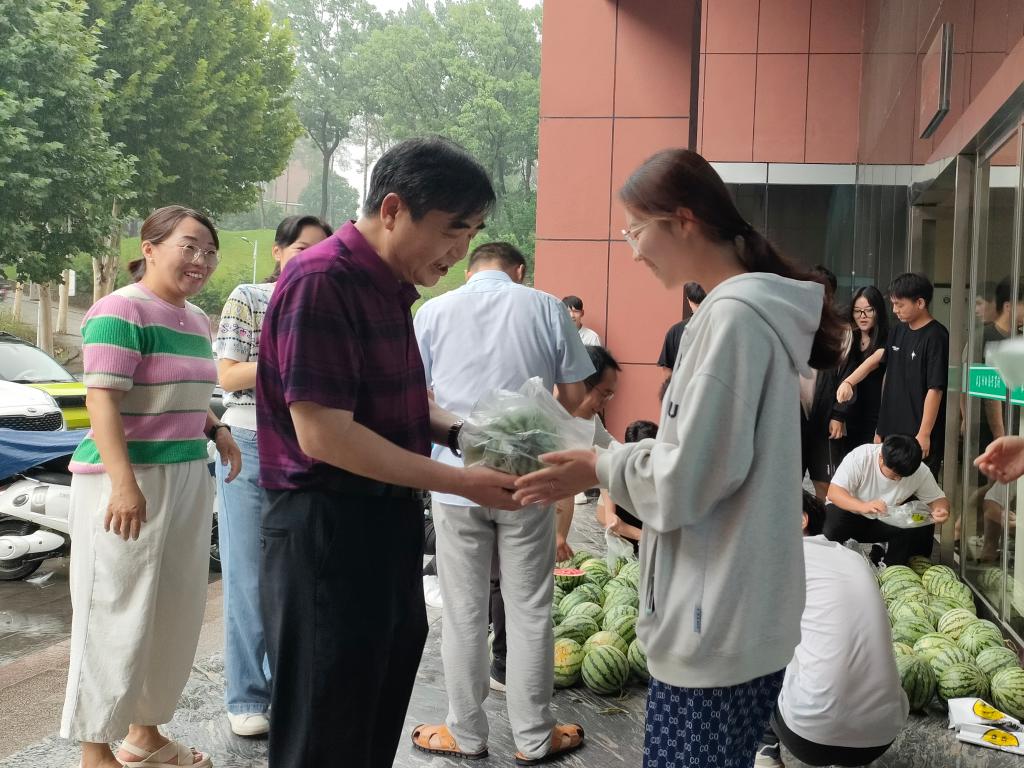 随后,领导老师们为同学们一一送上慰问品,用圆圆的西瓜为同学们送清凉送祝福,希望同学们都能圆满地完成考研复习,以完美的状态迎接2025年硕士研究生考试。