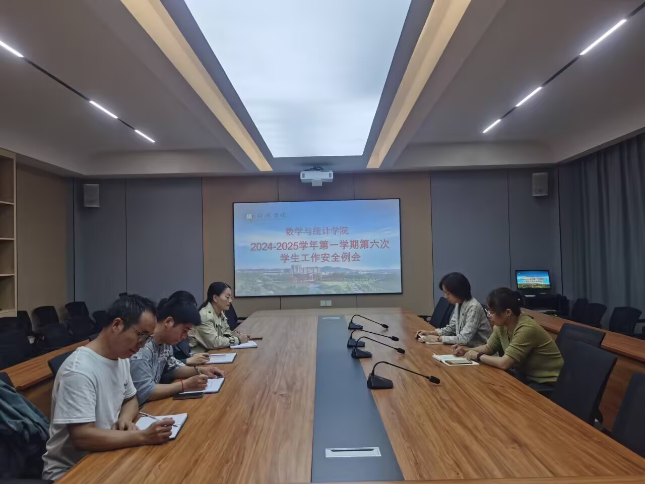 为确保学院学生安全管理工作的有序进行,10月16日,数学与统计学院2024-2025学年第一学期第六次安全工作例会在社科楼419会议室召开。党总支书记高昌慧,学工干事田媛以及全体辅导员参会,会议由田媛主持。