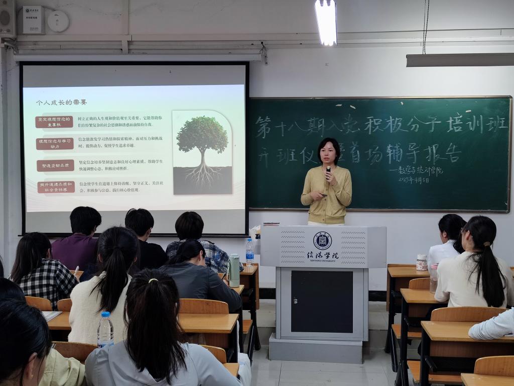4月11日,第一教工党支部书记邓涛以《放飞青春梦想,争做合格党员》为题,从“入党的基本条件和党员的基本要求”“发展党员的基本程序”“端正入党动机,以实际行动争取早日入党”三个方面进行深入讲解,指出正确动机应是以马克思主义理论为指引,树立为共产主义事业奋斗终身、全心全意为人民服务的崇高理想。