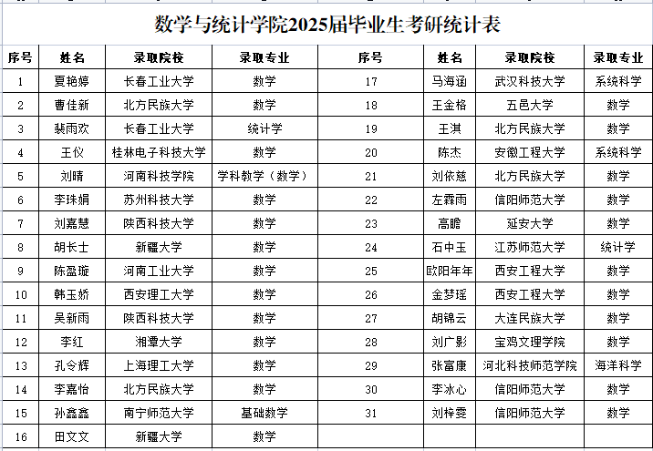截至2025年5月,数学与统计学院本科毕业生考研录取结果陆续揭晓,录取率稳中有升。我院2025届毕业生共计267人,其中有120人报考了研究生,报考率44.9%,其中过线人数36人,31人被录取,考研录取率11.6%,较去年提升了1.6%。其中胡长士、田文文、李红3名同学被新疆大学、湘潭大学“双一流”院校录取,同时涌现出4#415考研明星宿舍和21数学本01班考研明星班级。