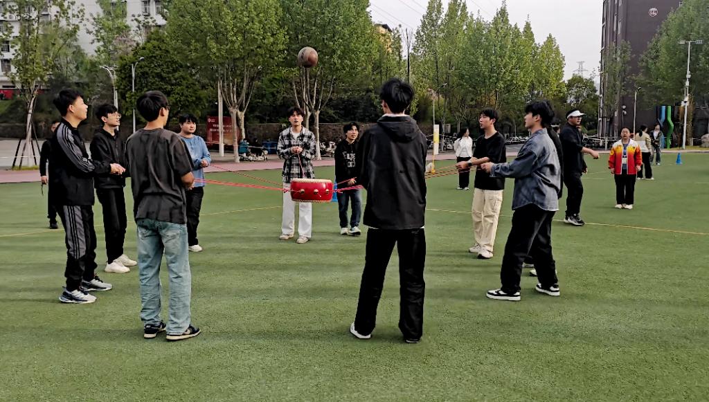 同心击鼓环节考验团队协调能力,大家拉紧鼓绳,专注配合,让皮球在鼓面上一次次弹起。