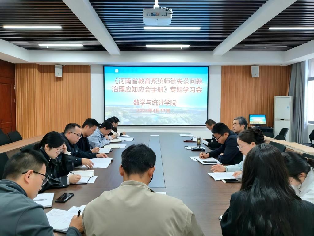 4月13日下午,数学与统计学院在综合楼715会议室召开《河南省教育系统师德失范问题治理应知应会手册》专题学习会。学院院长俞迎达、党总支书记郭二军、副院长张聪等班子成员、各支部书记、教师和辅导员代表参加了学习,会议由郭二军主持。