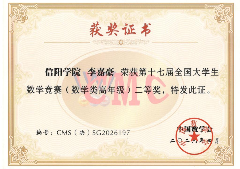 在本次高水平角逐中,我校数学与统计学院2022 级本科生李嘉豪凭借扎实的专业功底、过硬的专业素养稳定发挥,荣获国家二等奖,创下我校在此项赛事中的历史最好成绩,实现关键性突破。