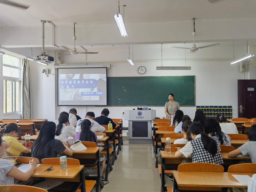 为提升师范生教学技能与创新实践能力,5月27日下午,数学与统计学院邀请信阳市第九中学高级教师王赵芳老师在社科楼306教室为2022级数学与应用数学专业学生做了“初中数学教学技能你能行”的主题讲座。