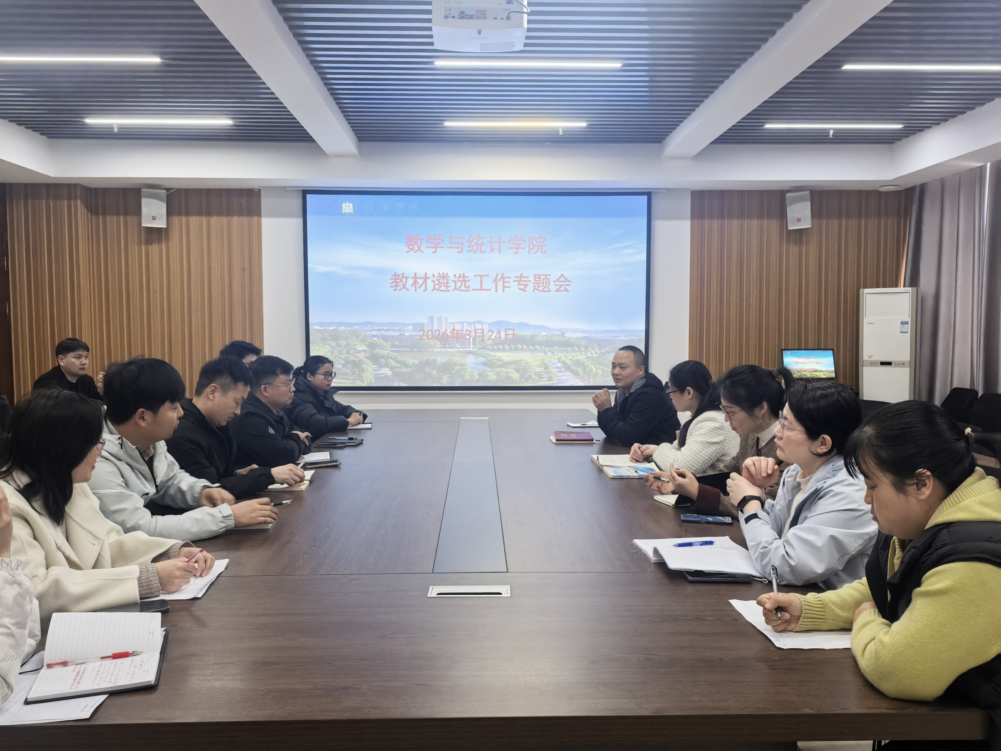 3月24日下午,数学与统计学院在综合楼715会议室召开教材遴选工作专题会,学院副院长张聪、教学干事熊林、各教研室主任及骨干教师参会。