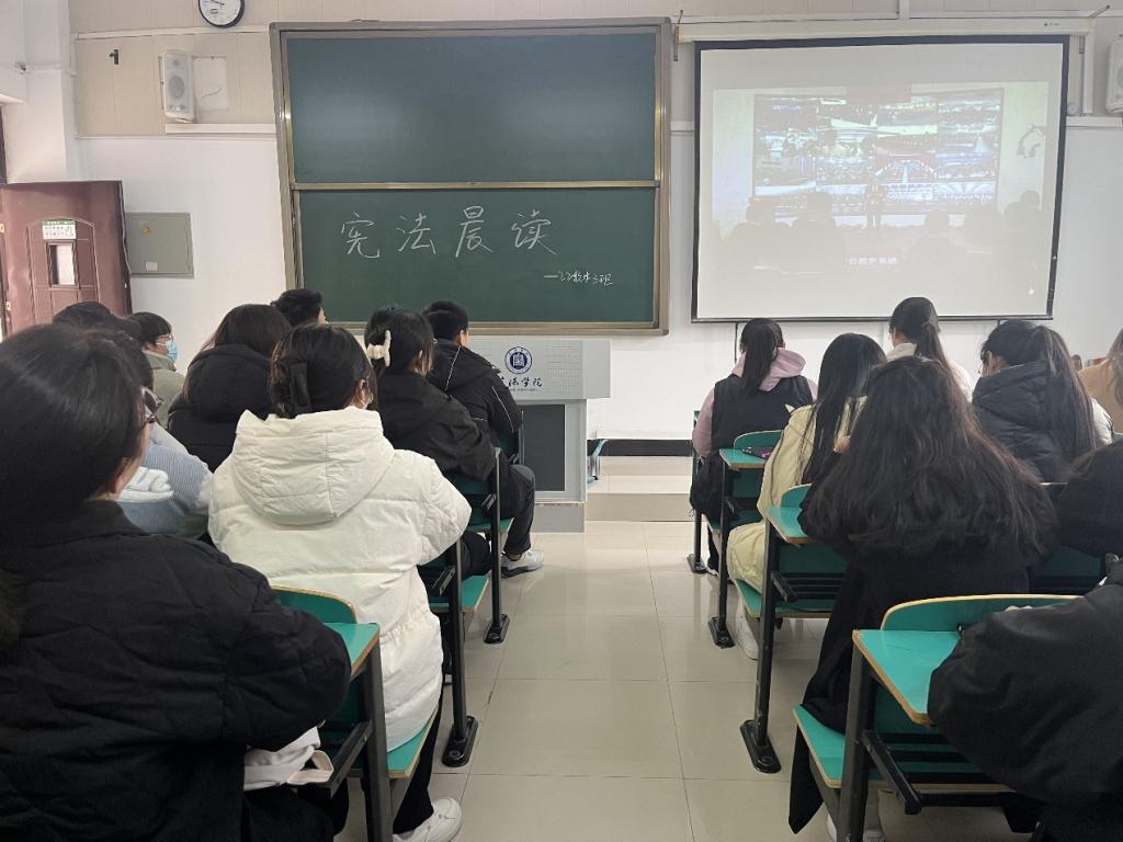 12月4日,学院组织各班级利用课前十分钟开展“宪法晨读”活动,大课间组织各班学生集中收看第十届国家宪法日教育系统“宪法晨读”活动,增强宪法意识,弘扬宪法精神,激励学生明确知法守法的重要性,将宪法精神融入今后的学习与生活中去。