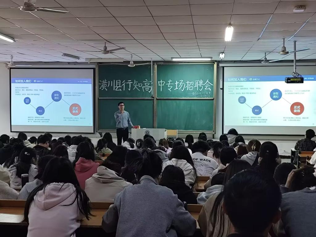 为进一步推进2025届毕业生充分就业,3月28日下午,数学与统计学院在社科楼112教室举行潢川县行知高中招聘宣讲会。