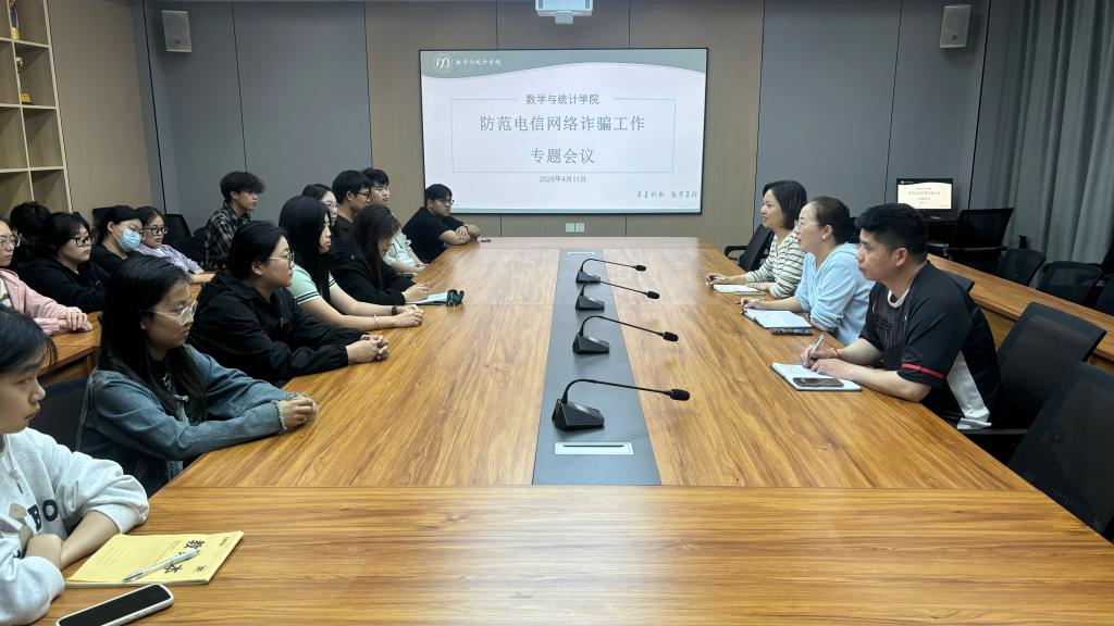 为积极响应学校加强校园安全管理的号召,切实提升学生对电信网络诈骗的防范意识与应对能力,数学与统计学院于4月11日在社科楼419会议室召开防范电信网络诈骗工作专题会议。学院党总支书记高昌慧、学工干事田媛、全体辅导员以及学生代表参加此次会议,会议由田媛主持。