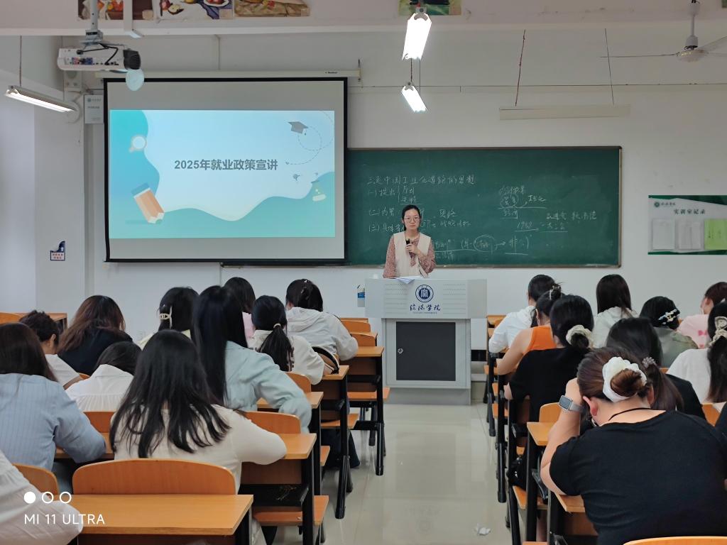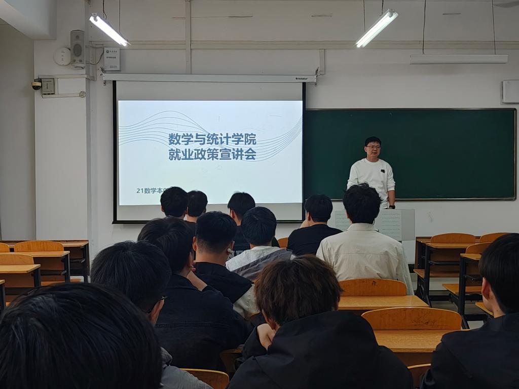 为进一步做好2025届毕业生就业工作,推动学院毕业生高质量就业,数学与统计学院于4月27日—28日在社科楼教室召开就业政策宣讲会。本次宣讲会由毕业班辅导员江燕、沈光阳、何勇主讲。