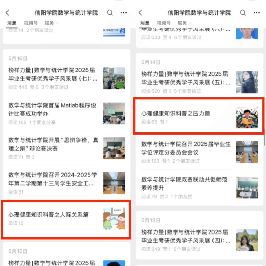 为了增加心理健康知识的普及范围,学院微信公号近期聚焦“人际关系”与“压力应对”两大主题,推送系列心理健康干货,使科学心理知识成为学生日常的“心灵充电宝”。