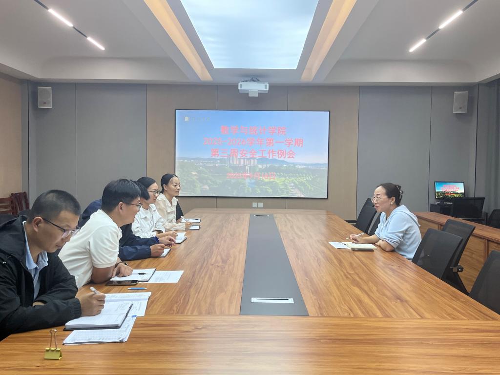 为进一步保障学生安全管理工作平稳有序,9月18日下午,数学与统计学院在社科楼419会议室召开2025-2026学年第一学期第三周安全工作例会,学工干事田媛及全体辅导员参会,会议由田媛主持。