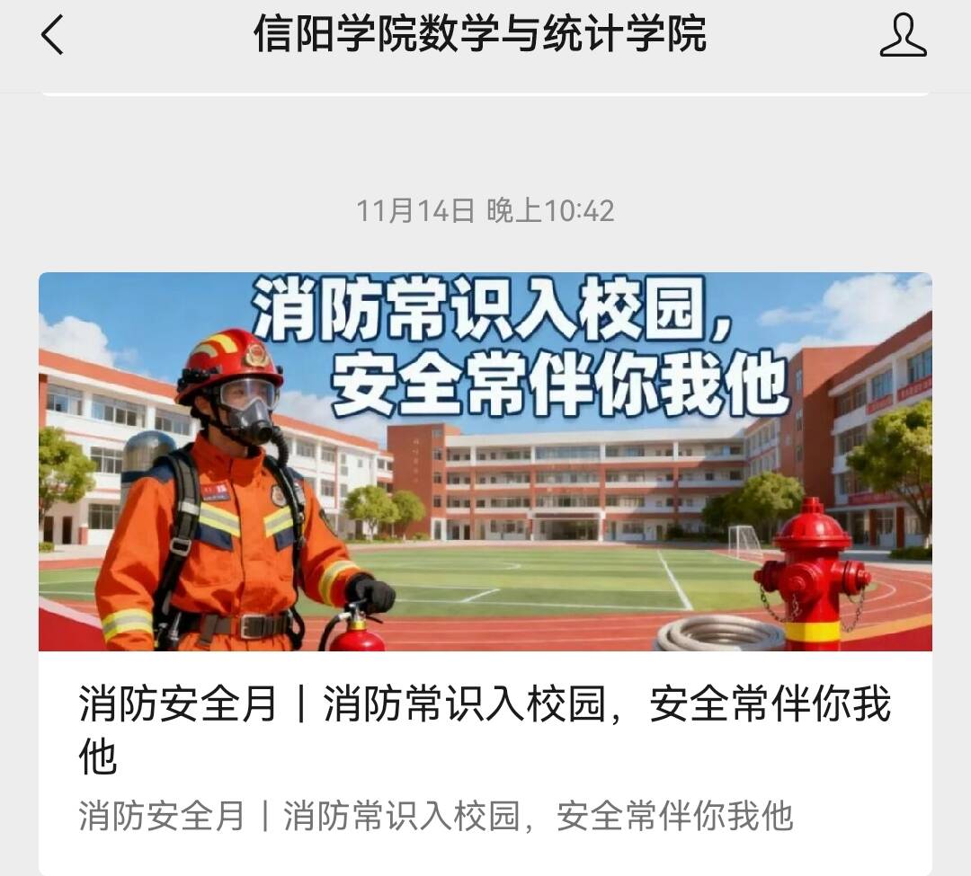 (二)线上宣传延伸:依托学院微信公众号,推送“消防常识入校园,安全常伴你我他”推文,同时通过班级群转发消防部门发布的警示案例、政策解读,形成“学院-班级-学生”三级宣传网络,让消防知识触手可及。