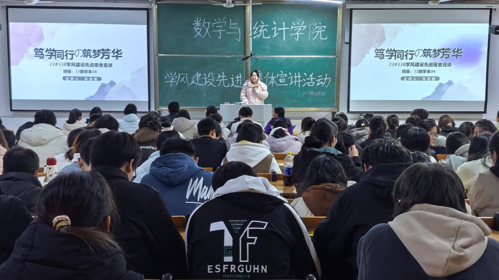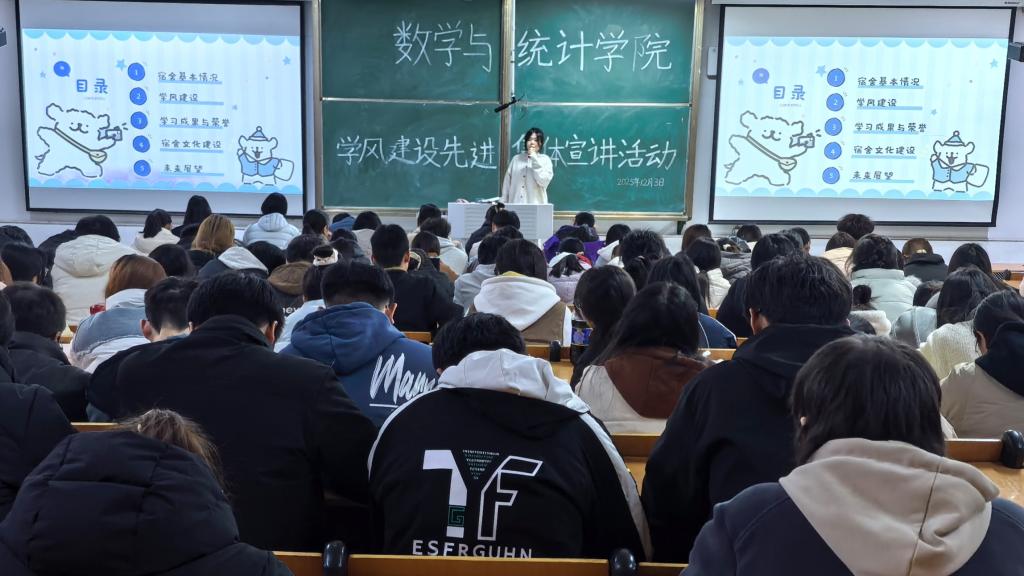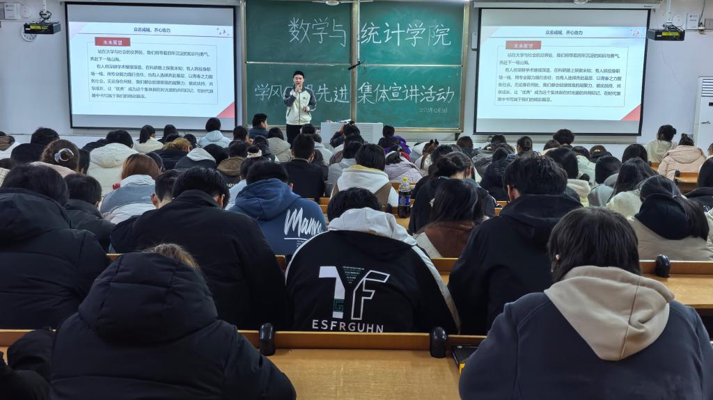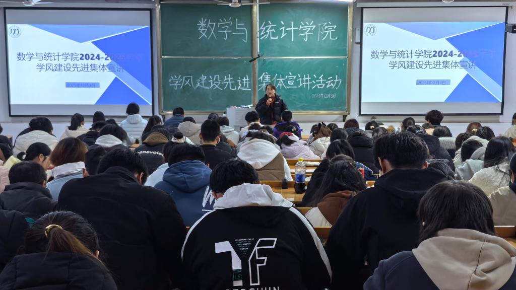 为发挥先进典型示范效应,纵深推进学风建设月活动,12月3日下午,数学与统计学院在社科楼112教室举办学风建设先进集体宣讲活动,学工干事田媛、全体辅导员及23级、24级、25级学生代表参加。