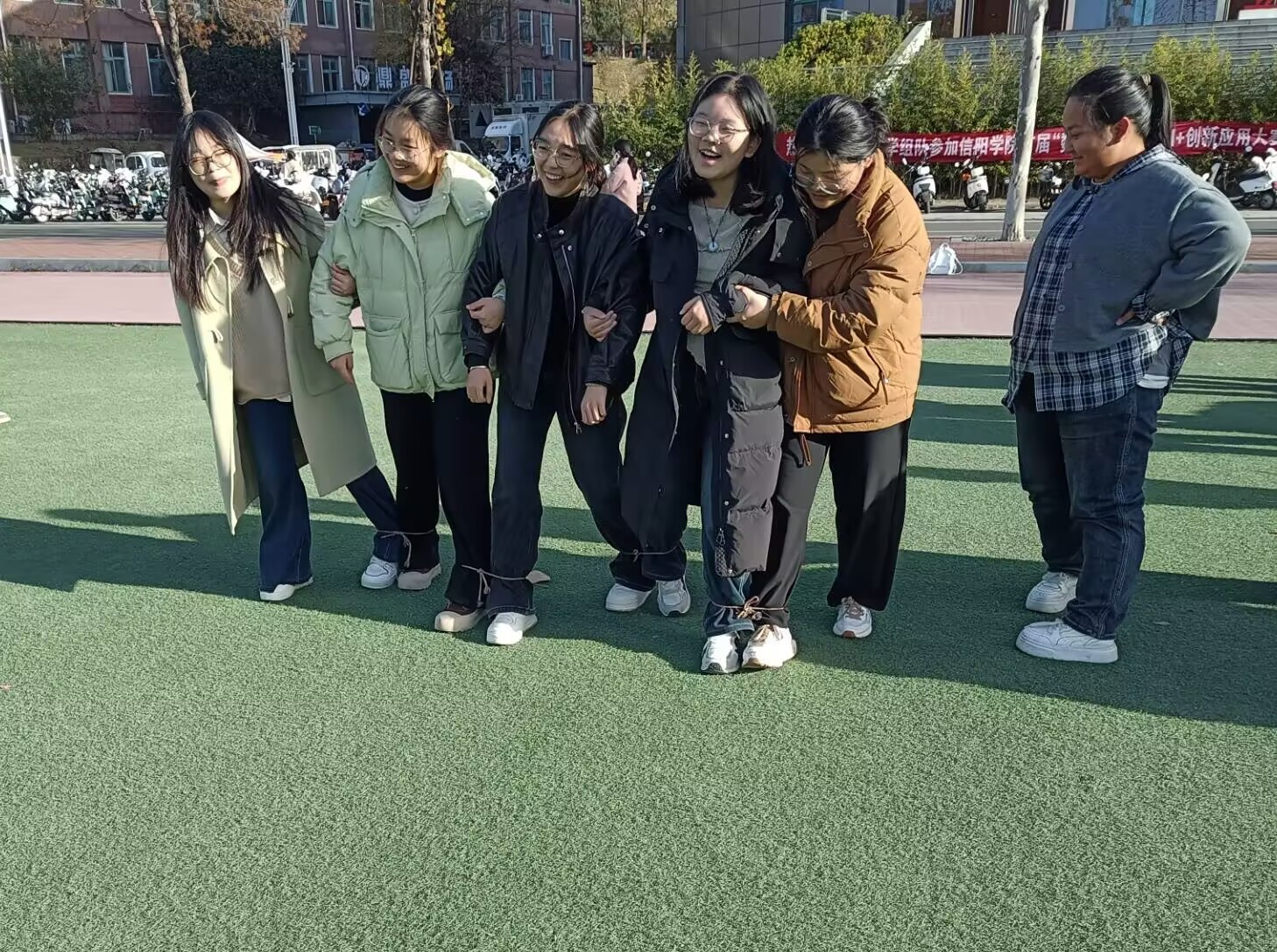 随后,开展的“5人6足”游戏考验着团队协作能力。同学们自由组队,将相邻两人的脚踝绑在一起,在指定赛道上共同向终点迈进。游戏过程中队员们相互扶持、调整节奏,有的队伍配合默契、快速前行,有的队伍虽偶有失误却不气馁,在欢声笑语中完成挑战。该游戏不仅锻炼了同学们的协调能力与团队凝聚力,更让大家深刻体会到“分工协作、彼此信任”的重要性。