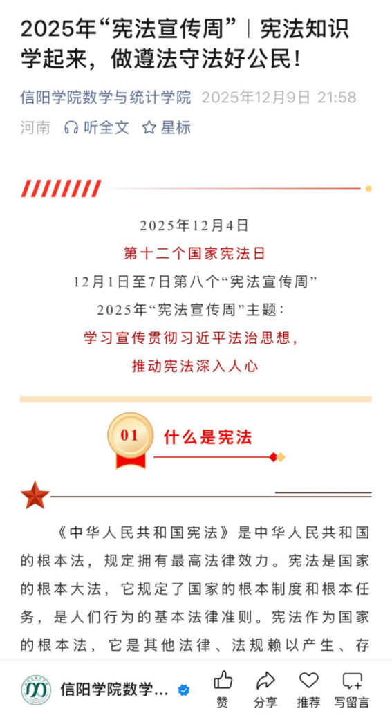为深入学习贯彻习近平法治思想,落实全国全省教育大会精神,12月1日至7日,数学与统计学院紧扣“学习宣传贯彻习近平法治思想,推动宪法深入人心”的活动主题,精心策划并开展了系列宪法宣传教育活动。