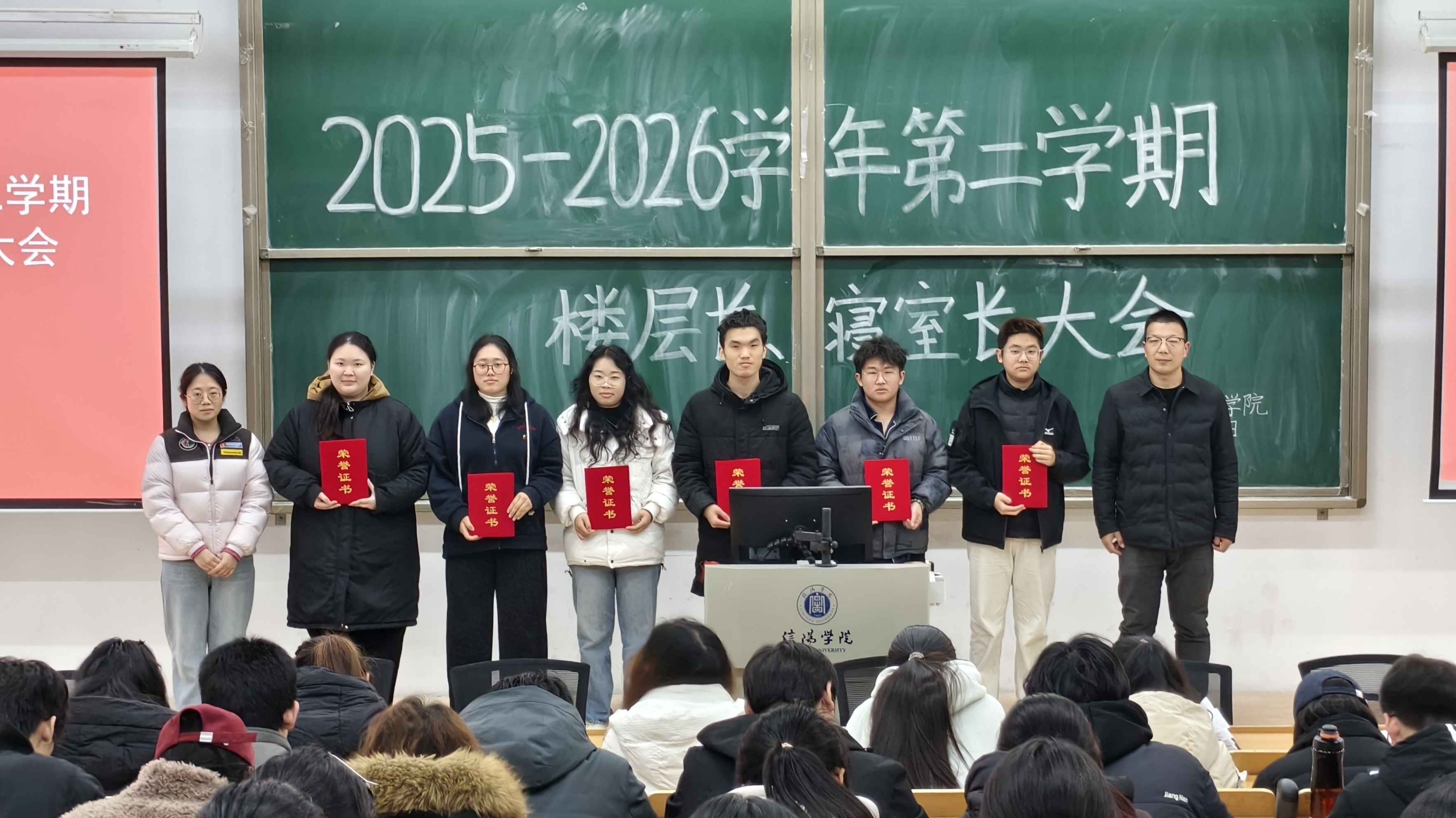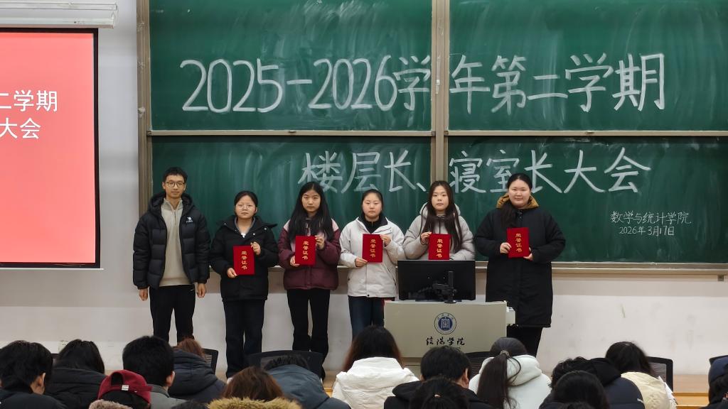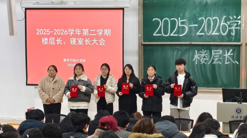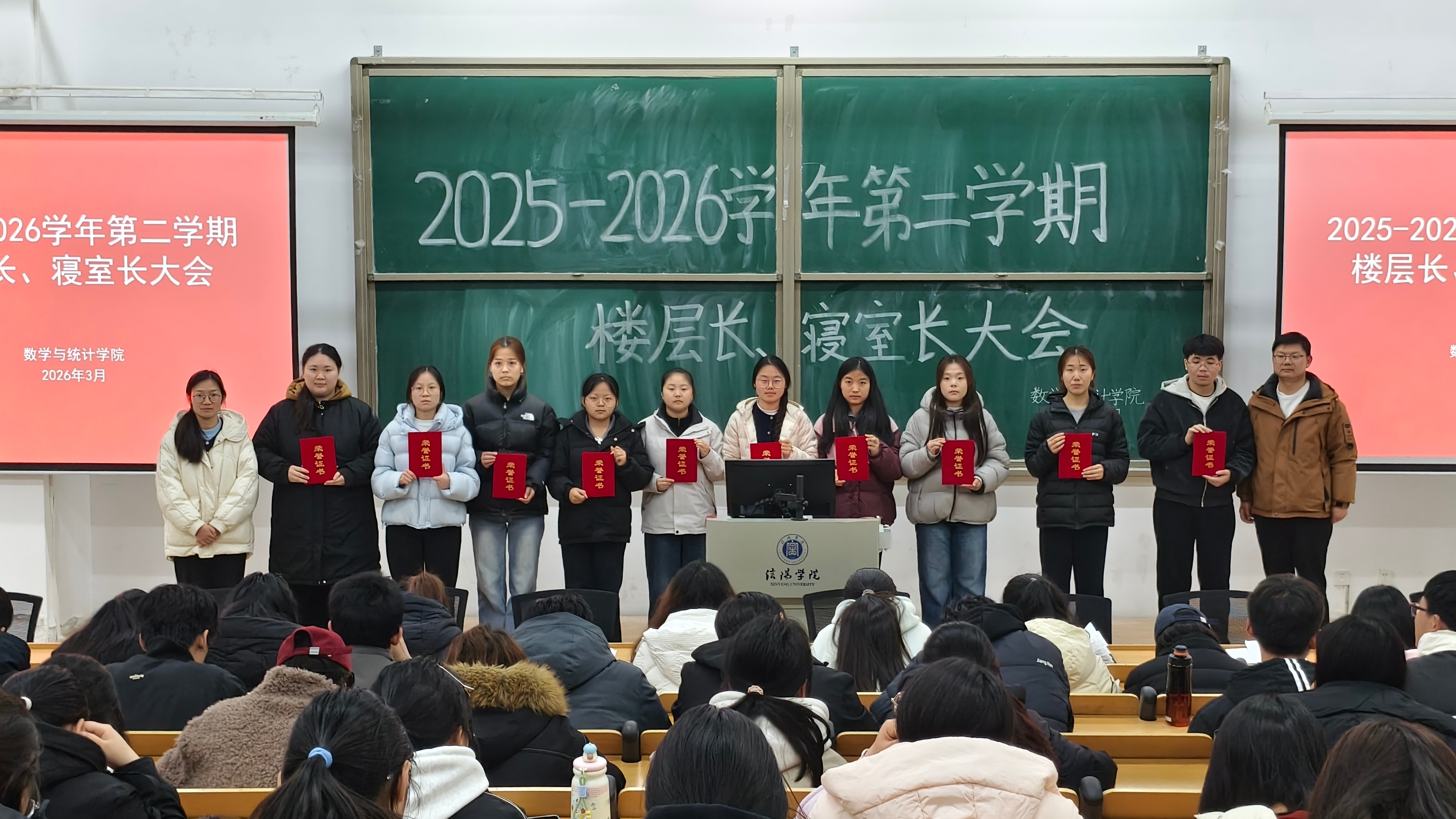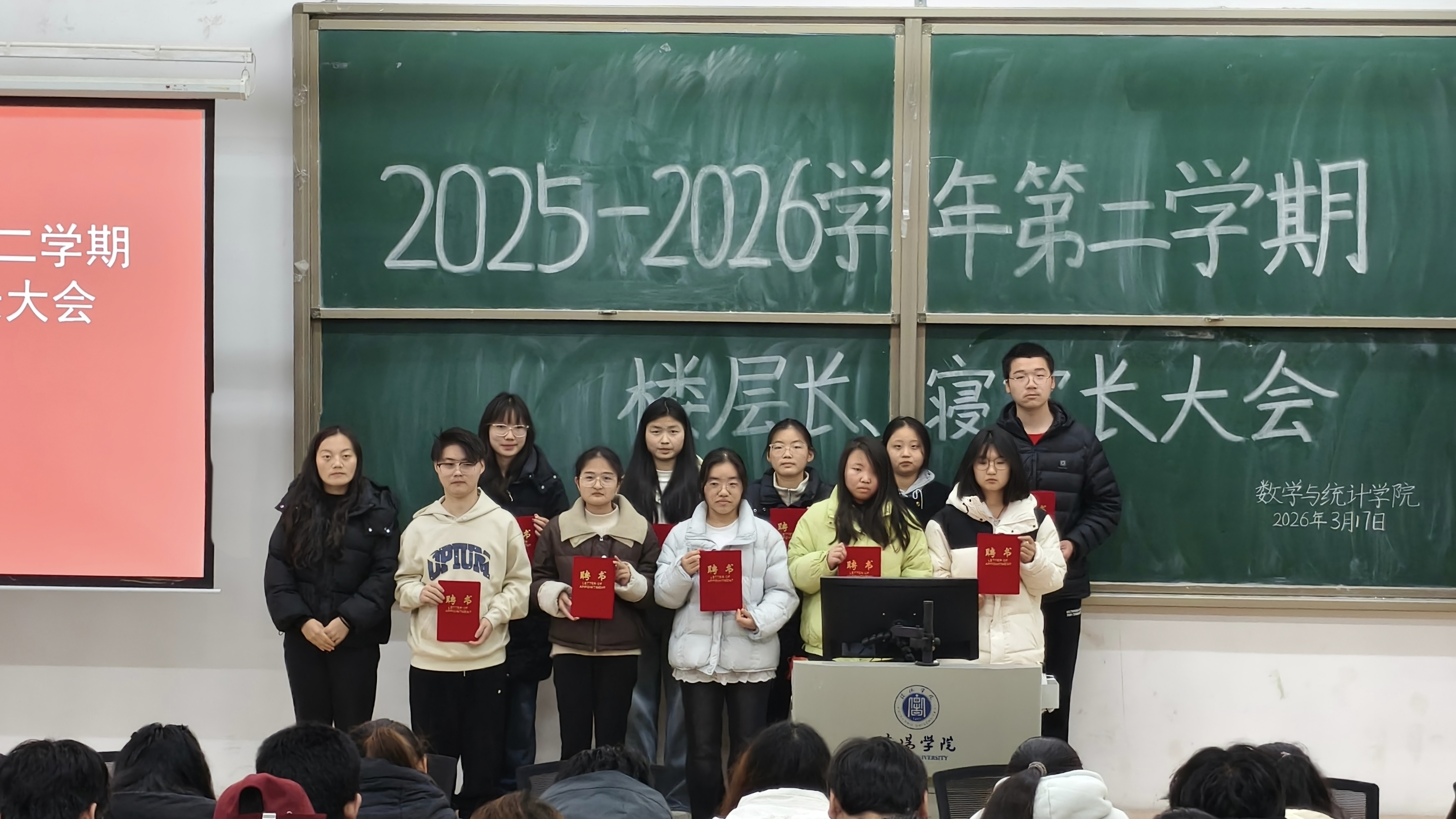 大会在热烈的氛围中拉开帷幕。首先,团总支书记孙美宣读了《数学与统计学院关于2025-2026学年第二学期楼层长、寝室长的聘任决定》《数学与统计学院关于2025-2026学年第一学期优秀楼层长、优秀寝室长、优秀寝室的表彰决定》。