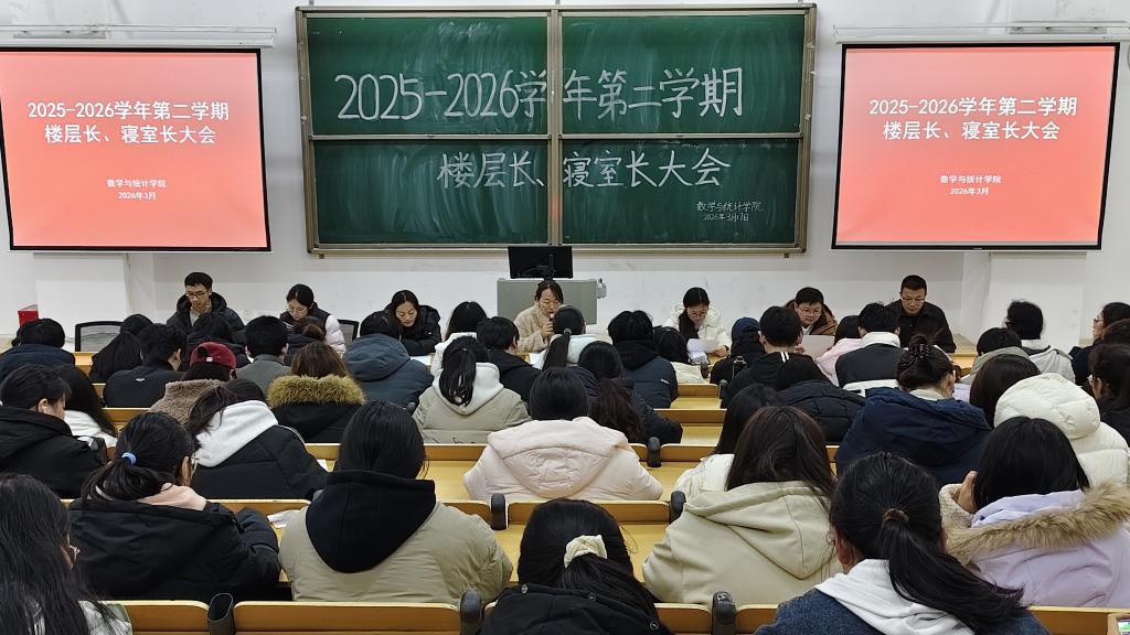 为进一步夯实宿舍育人阵地,提升宿舍精细化管理水平,明确学生骨干职责,筑牢校园安全防线,营造积极向上、健康文明的宿舍氛围,3月17日晚,数学与统计学院在综合楼202教室召开了2025-2026学年第二学期楼层长、寝室长大会。学院党总支副书记田媛、全体辅导员及各楼层长、寝室长参加了此次会议。大会由田媛主持。