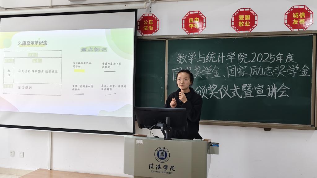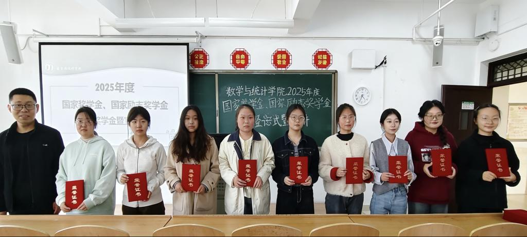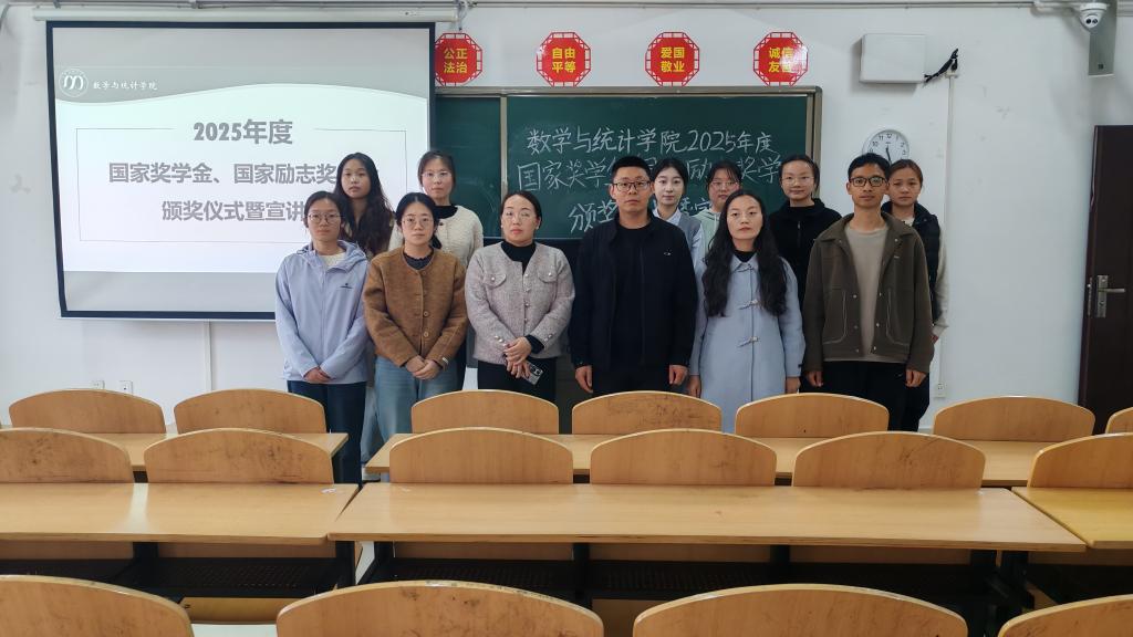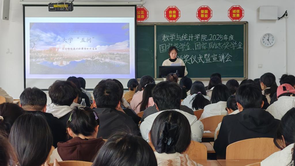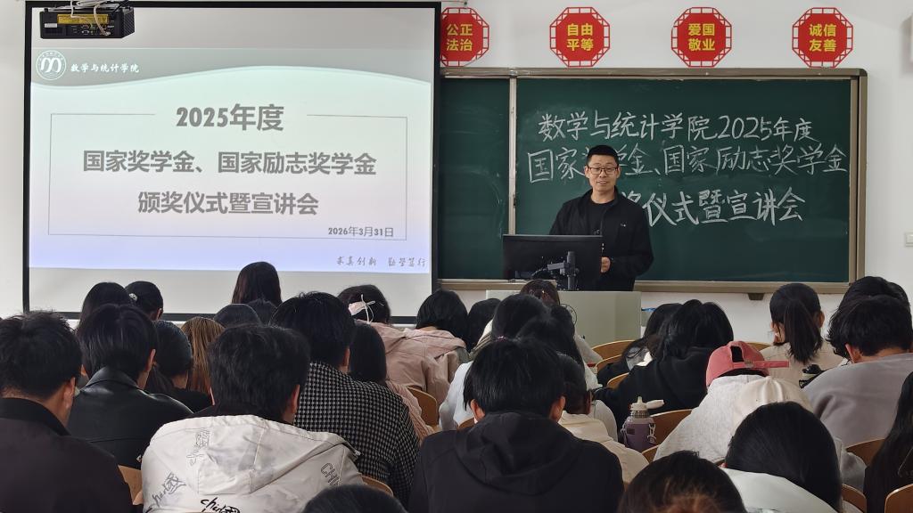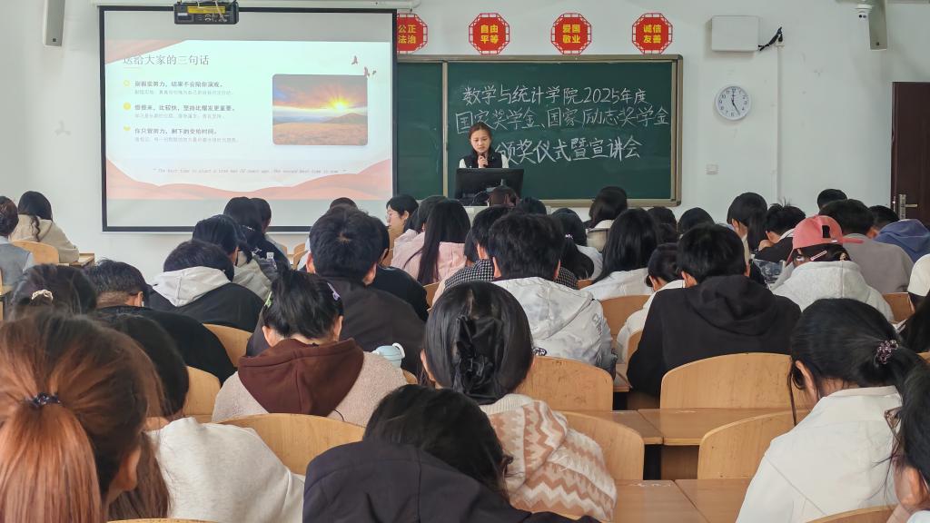 为充分发挥优秀学生榜样示范引领作用,表彰先进、树立典型,激励全院学生勤学笃行、励志成才,3月31日下午,数学与统计学院在综合楼506教室开展2025年度国家奖学金、国家励志奖学金颁奖仪式暨学生励志事迹宣讲活动。学院党总支书记郭二军、党总支副书记田媛、全体辅导员及学生代表参加本次活动。