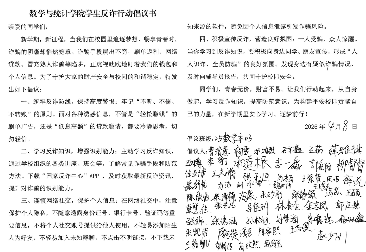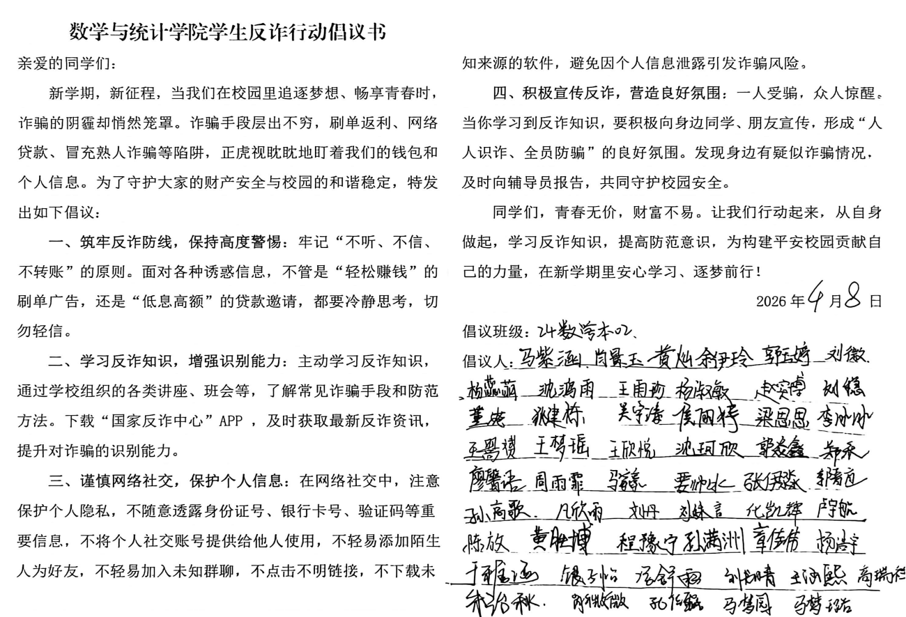 为强化学生反诈责任意识,推动反诈行动落地见效,学院组织各班开展反诈行动倡议书签署活动。倡议书中明确提出增强防范意识、谨防各类诈骗、保护个人信息、及时举报诈骗行为等具体要求,号召每一位同学争做反诈宣传的参与者、践行者和传播者。