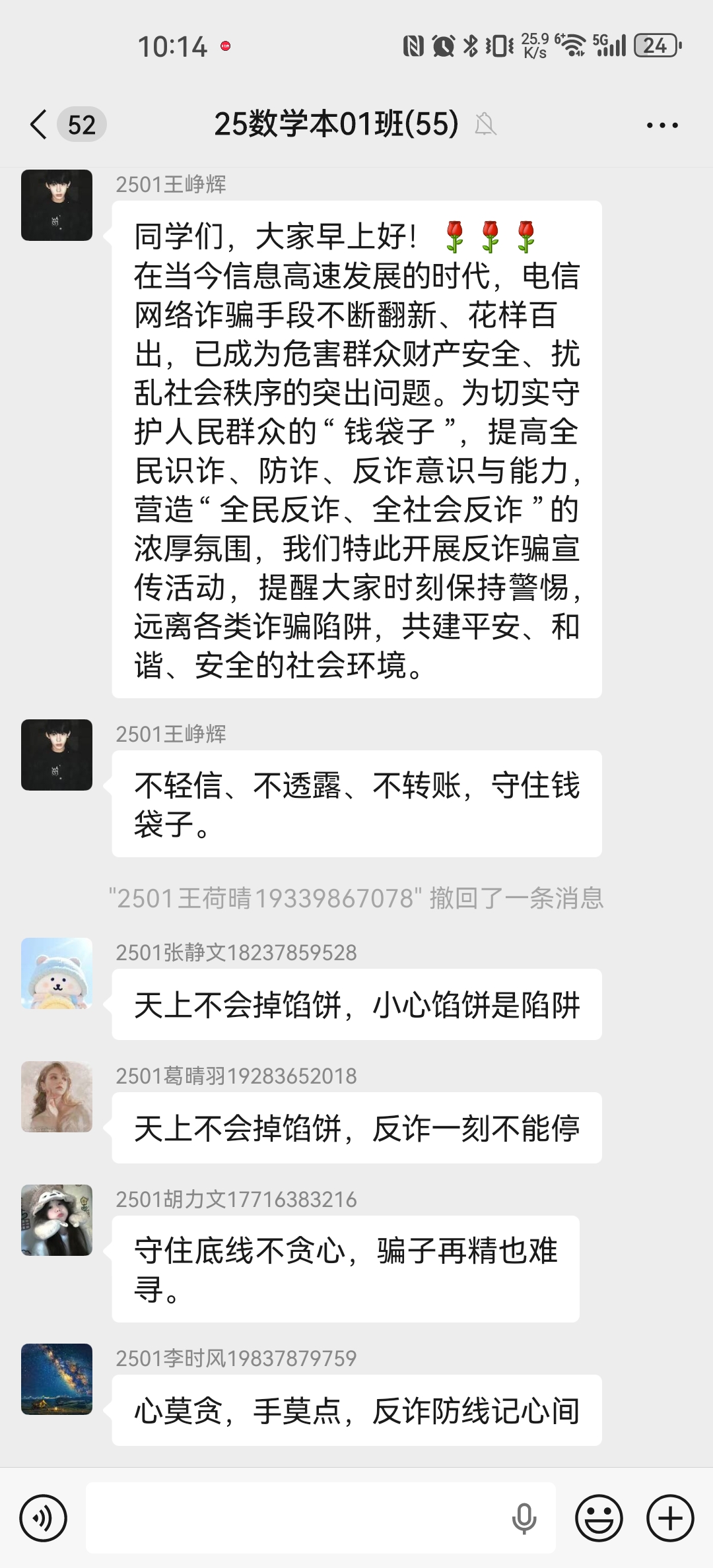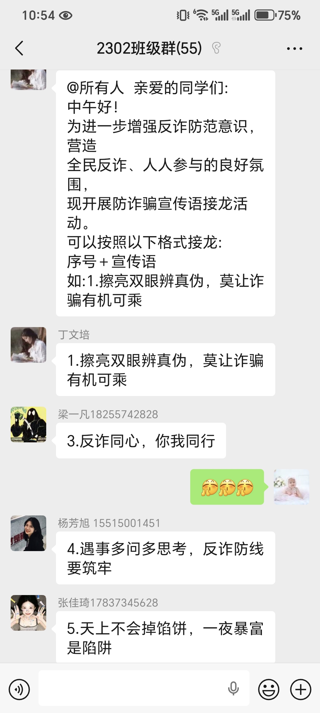 为打破传统说教模式,各班创新开展班级反诈标语接龙活动。同学们围绕“防范诈骗”“安全第一”等主题,踊跃创作朗朗上口、接地气的宣传口号。这种趣味互动的形式不仅活跃了班级氛围,更让反诈知识在潜移默化中入脑入心。