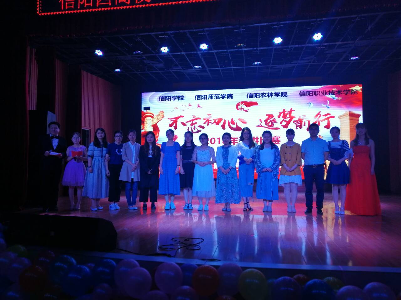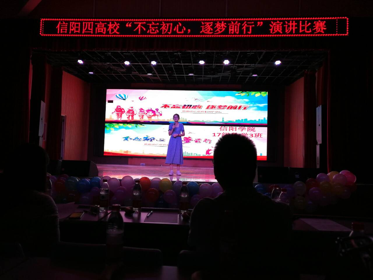 为深入学习宣传贯彻党的十九大精神,引导广大青年进一步坚定理想信念,增强责任感和使命感,5月25号晚7点由信阳学院、信阳师范学院、信阳职业技术学院、信阳农林学院联合举办,信阳学院数学与信息学院、演讲与口才协会承办“不忘初心,逐梦前行”演讲比赛活动在信阳学院大学生活动中心举行。信阳市四所高校从三月初开始本次比赛的宣传、海选、初赛等环节,最终有八名选手成功晋级决赛。信阳职业技术学院许磊老师、信阳学院团委周扬老师、商学院团总支书记陈苗苗老师、商学院李青林老师、文学院王炎老师、文学院袁婉秋老师、数学与信息学院团总支书记王晶老师、数学与信息学院徐雪涵老师和社团联合会主席梁成枢、数学与信息学院主席李一帆以及各兄弟社团代表应邀参加此次活动。