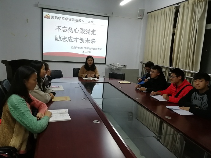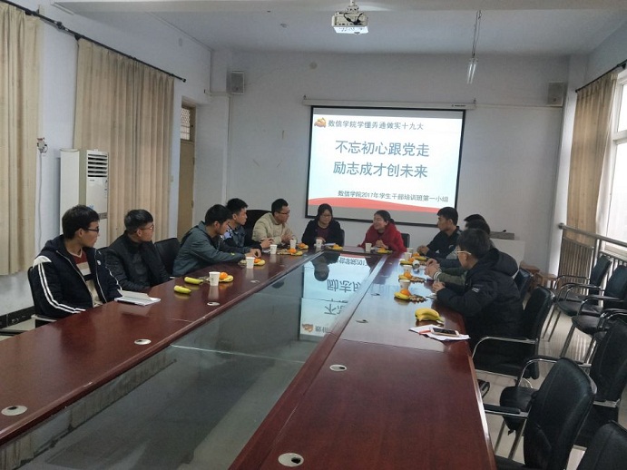 本次培训于11月14日开班,党总支书记张俊忠作了题为《学懂弄通做实党的十九大精神 奋力走好新时代长征路》辅导。随后,分组进行“不忘初心跟党走,励志成才创未来”实践活动。团总支书记、辅导员王晶负责第一组,邀请理工学院团总支书记粱书荣、学生会主席阚攀攀及部分班级班长进行学习交流活动,并组织主题班会观摩活动。