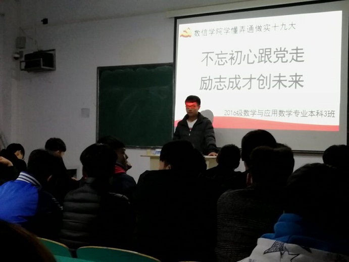 12月22日下午,数信学院学习贯彻党的十九大精神专题培训总结会在数计楼510会议室召开。党总支书记张俊忠,学工干事李平,辅导员徐雪涵、朱纪诚和32名学生党员、学生干部参加。