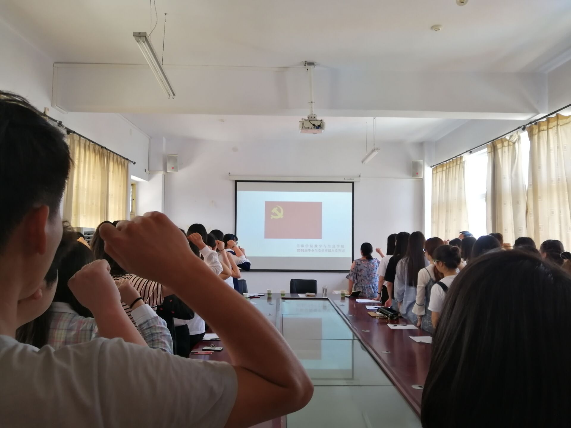 5月14日,数信学院2018届毕业生党员大会在数计楼510会议室召开。党总支书记张俊忠,学生一支部书记、辅导员司杰,学生二支部书记、辅导员何珊珊,辅导员徐雪涵和43名毕业生党员参加会议。会议由司杰主持。
