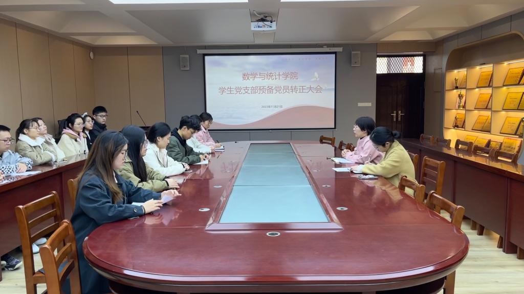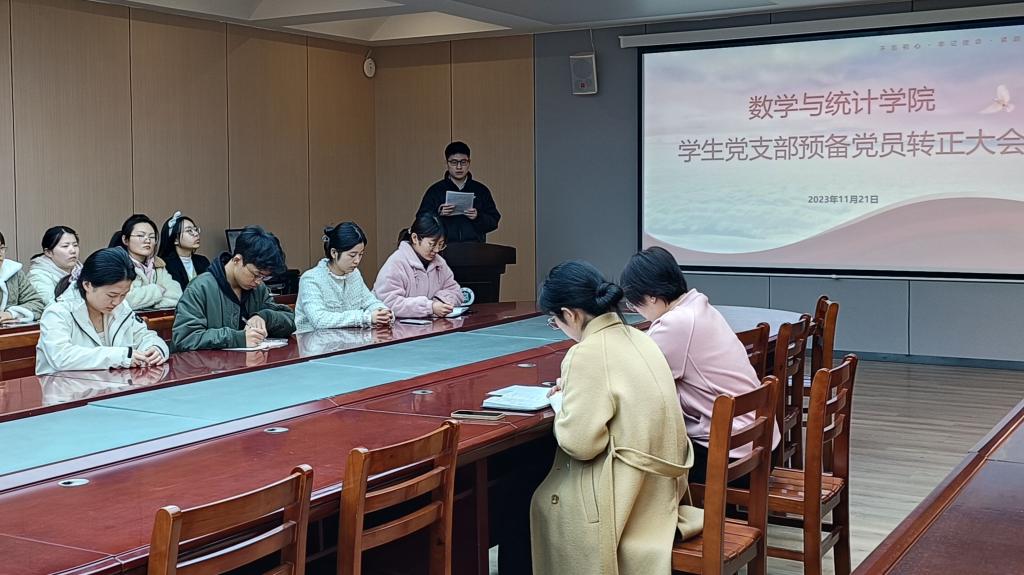 11月21日,数学与统计学院在数计楼407会议室召开学生党支部预备党员转正大会,学生党支部书记田媛、组织员范学琴、全体学生党员参会,会议由范学琴主持。