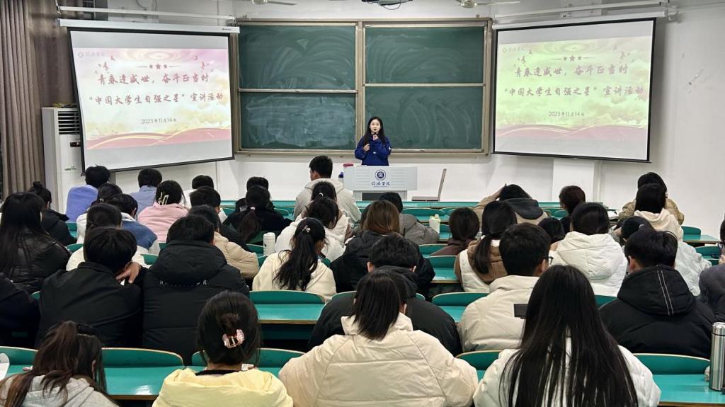 为了激励我院学生自信、自力、自强,培养勇于担当、砥砺奋进的新时代青年。11月30日,数学与统计学院在数计楼107教室开展“青春逢盛世,奋斗正当时”宣讲活动,2023级新生代表参加本次宣讲,“中国大学生自强之星”张雪儿担任主讲。