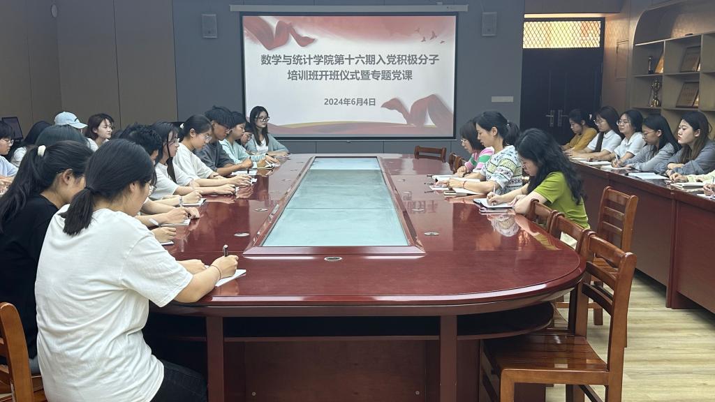 6月4日,数学与统计学院党总支在数计楼407会议室举行第十六期入党积极分子培训班开班仪式暨专题党课。学院党总支书记高昌慧、学生党支部书记田媛、组织员范学琴以及第十六期全体入党积极分子参加学习活动,仪式由田媛主持。