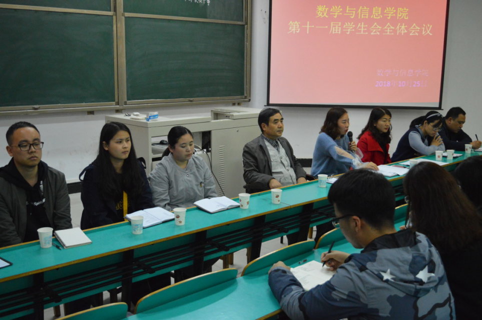 10月25日下午,数学与信息学院在数计楼106教室召开了第十一届学生会全体会议,院长俞迎达,学工干事李平,行政干事闫珍珠,团总支书总书记王晶,全体辅导员,学生会全体成员,各班班长、学习委员参加了会议。会议由王晶主持。